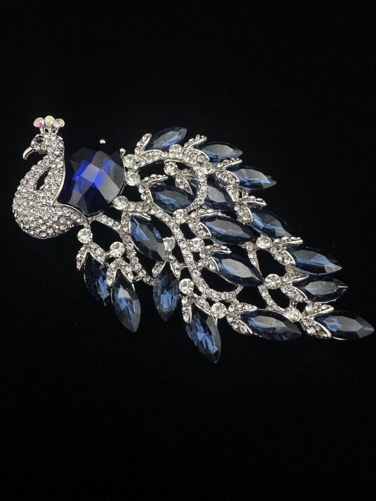 Diese kunstvolle Brosche in Form eines Pfaus besticht durch ihr schimmerndes Spiel aus silbernen und tiefblauen Strasssteinen. Ihr elegantes Design verleiht jedem Outfit einen glamourösen, leicht exotischen Akzent – ein strahlendes Statement für besondere Momente.