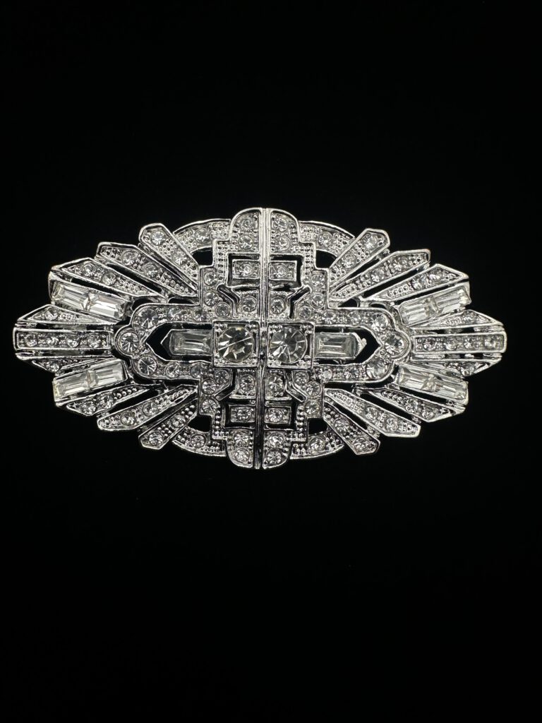 Diese elegante, silbern glänzende Strassbrosche in ovaler Form vereint klare Linien und geometrische Formen im typischen Art-Déco-Stil. Funkelnde Strasssteine verleihen ihr einen zeitlosen, glamourösen Ausdruck. Ein stilvolles Accessoire, das jedem Outfit eine dezente, doch ausdrucksstarke Note verleiht.