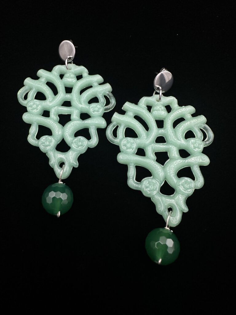 Diese außergewöhnlichen Ohrringe bestehen aus filigran verästeltem, jadefarbenem Resin, an dem eine runde Kugel aus kräftigem grünem Chrysopras hängt. Das Zusammenspiel von zart strukturierter Oberfläche und leuchtender Edelsteinfarbe verleiht dem Schmuckstück eine harmonische, lebendige Ausstrahlung.