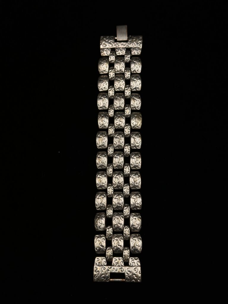 Dieses elegante, silberfarbene Vintage-Armband zeichnet sich durch sein besonderes Gliederdesign mit ringförmigen Elementen aus. Die feine Struktur sorgt für eine stilvolle Ausstrahlung und macht es zu einem dezenten, aber wirkungsvollen Accessoire. Ideal, um jedem Look eine edle Note zu verleihen.