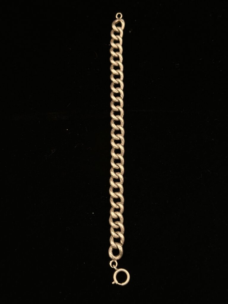 Dieses elegante Vintage-Armband aus Silber überzeugt durch sein markantes Kettendesign mit strukturierten Gliedern. Die hochwertige Verarbeitung unterstreicht seine edle Ausstrahlung und macht es zu einem stilvollen Blickfang. Ein zeitloses Accessoire, das jedem Outfit eine besondere Note verleiht.