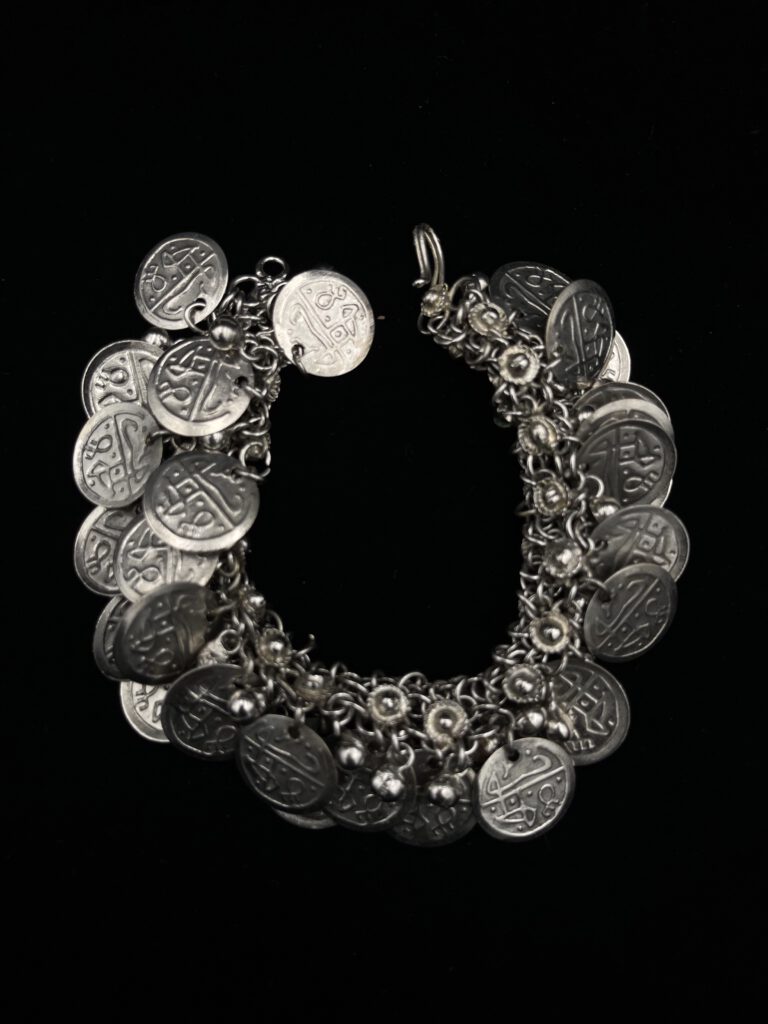 Dieses ausdrucksstarke Vintage-Armband in Silberoptik besticht durch seine zahlreichen dekorativen Münzanhänger und filigranen Details. Die beweglichen Elemente verleihen dem Schmuckstück eine besondere Dynamik und machen es zu einem echten Blickfang. Ein einzigartiges Accessoire, das jedem Outfit eine individuelle und stilvolle Note verleiht.