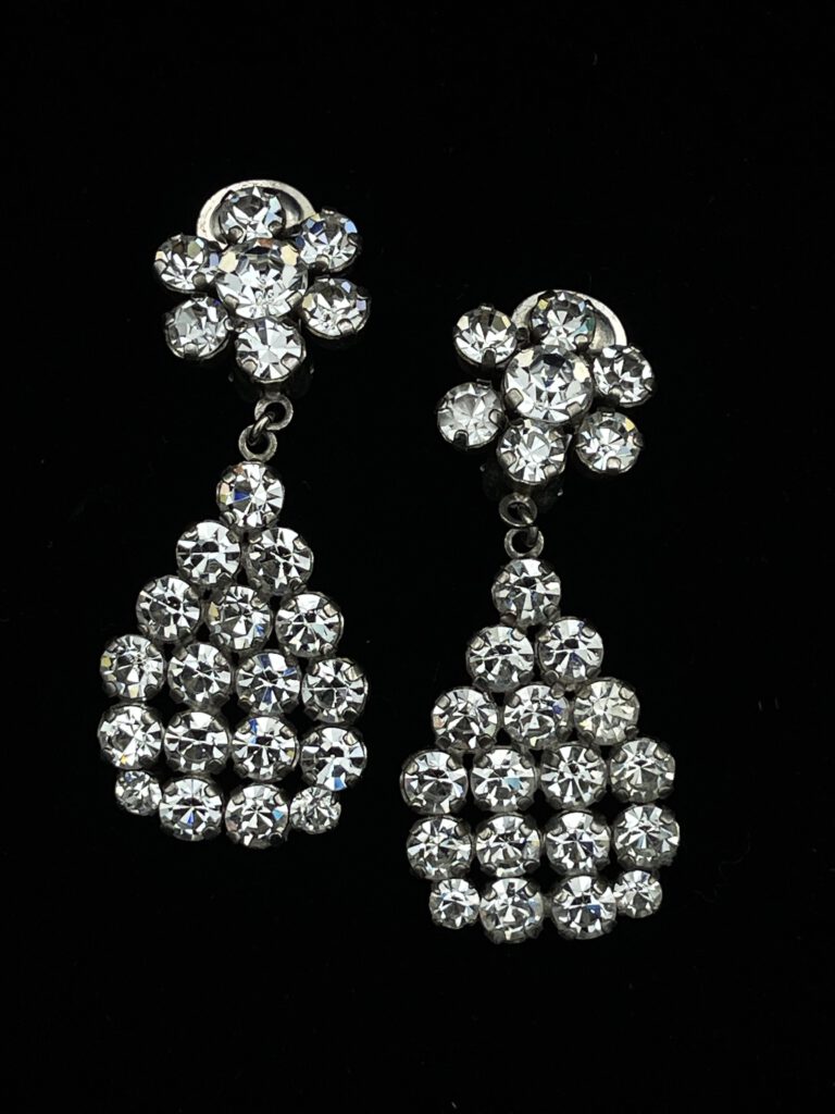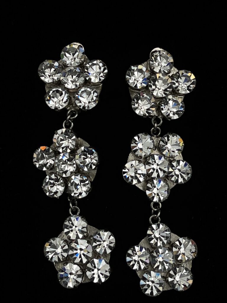 Diese funkelnden, hängenden Vintage-Ohrclips begeistern mit ihrem filigranen Blümchen-Design und ihrer eleganten Ausstrahlung. Die signierte Ausführung ‚Scooter Paris‘ unterstreicht ihren besonderen Charakter und macht sie zu einem stilvollen Blickfang. Ein feines Accessoire, das jedem Outfit eine feminine und edle Note verleiht