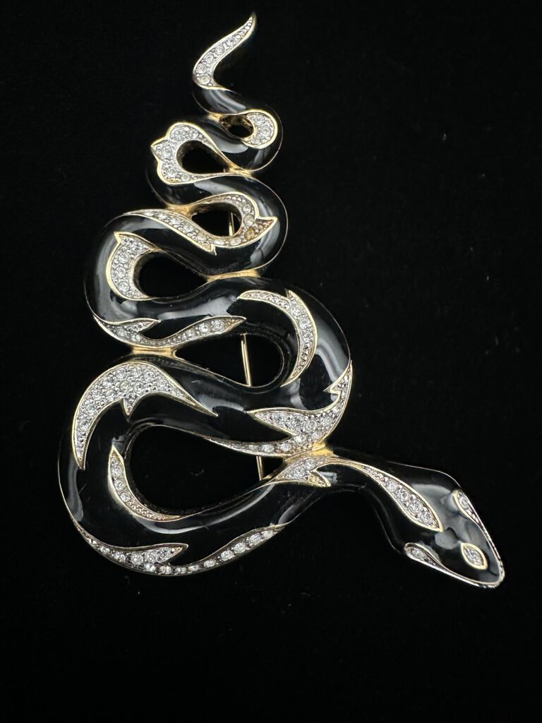 Diese edle Brosche zeigt eine elegant geschwungene schwarze Schlange, deren Körper kunstvoll mit funkelnden Strasssteinen verziert ist. Die goldfarbene Fassung setzt strahlende Akzente und verleiht dem geheimnisvollen Design eine luxuriöse Note. Ein ausdrucksstarkes Accessoire, das jedem Outfit eine stilvolle und zugleich außergewöhnliche Wirkung verleiht.