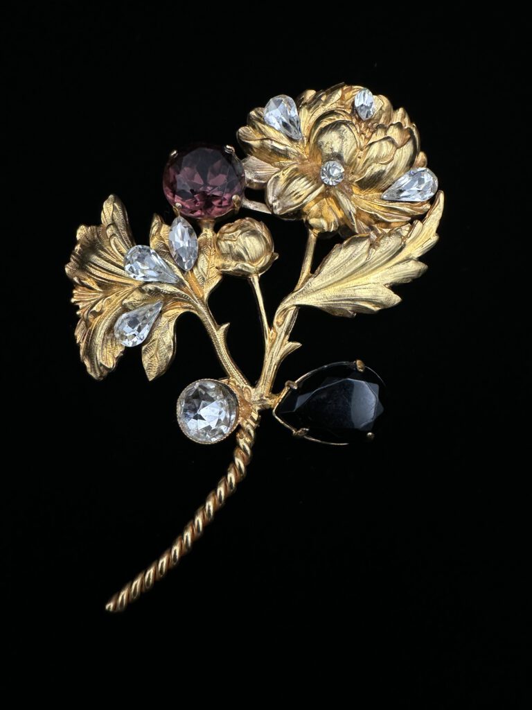 Diese außergewöhnliche, goldfarbene Brosche von Yves Saint Laurent ist ein echtes Unikat und wurde als Teil einer seiner Shows präsentiert. Das kunstvolle Design zeigt eine elegante Blüte am Stiel, verziert mit funkelnden silbernen Strasssteinen sowie einem markanten schwarzen und einem tief dunkelroten Stein. Rückseitig signiert, vereint dieses seltene Stück die unverwechselbare Handschrift des Hauses YSL […]