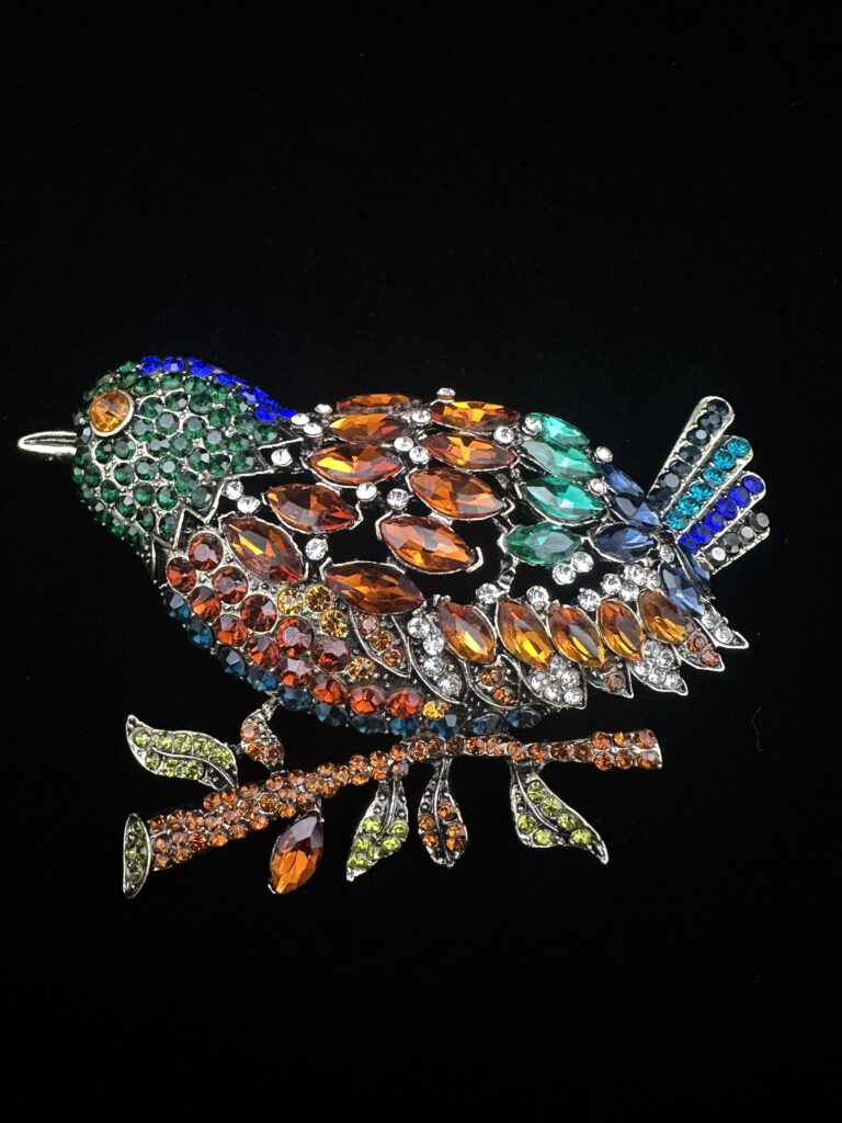 Diese charmante Brosche zeigt einen elegant gestalteten Vogel, der auf einem feinen Zweig sitzt und von farbenfrohen Strasssteinen geschmückt wird. Durch ihr lebendiges Funkeln und die liebevollen Details setzt sie einen fröhlichen, verspielten Akzent – ein farbenprächtiges Highlight für jedes Outfit.