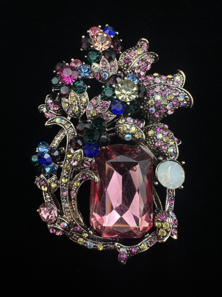 Eleganz in Schwarz und Silber: Diese außergewöhnliche Vintage-Brosche zeigt einen filigranen Blütenreigen, verziert mit funkelnden Strasssteinen und edlen schwarzen Akzenten. Ein zeitloses Schmuckstück mit Charakter – perfekt für besondere Auftritte oder als stilvolles Detail im Alltag.