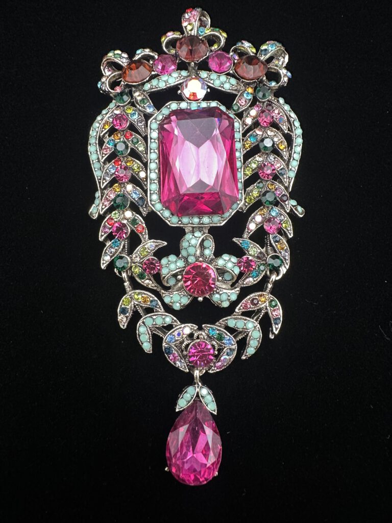 Diese elegante Fantasie-Brosche in floraler Form zieht mit ihrem großen, strahlend pinken Mittelstein sofort alle Blicke auf sich. Zarte Details und ein schwingender pinkfarbener Anhänger verleihen ihr zusätzliche Leichtigkeit und Ausdruckskraft. Ein farbenfrohes Highlight, das jedem Outfit eine feminine, verspielte Note schenkt und auch als Anhänger an einer Kette getragen werden kann.